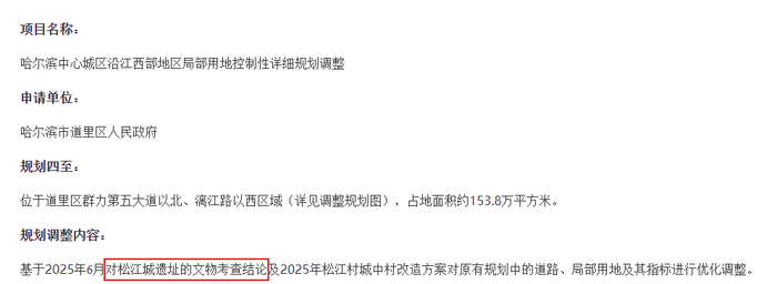 2025年9月,哈尔滨市自然资源和规划局发布的一则规划调整公示,揭开了这场平衡之战的序幕。根据半年前刚刚确定的松江城遗址文物考察结论,原有规划中多条道路被取消,商业用地“变身”公园绿地,群力大道下穿通道改为平交……一切调整,都指向一个核心命题:当城市更新遇上文物保护,我们该如何选择?