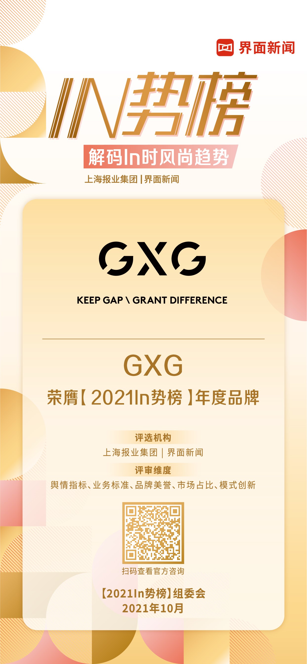 10月14日,上海报业集团|界面新闻在上海中心J酒店举办了2021【In势榜】颁奖典礼。国内时尚行业领军者共聚盛会,聚焦时尚产业趋势,挖掘时尚生态特点。集结知名供应链、品牌专家,力邀行业头部企业和时尚KOL参与盛典,共同探讨新消费时代带给潮流服饰品牌的机遇与挑战。GXG凭借一体化的全渠道商业模式,整合各项优势资源,为消费者提供高质量的时尚服务,荣膺年度品牌。
