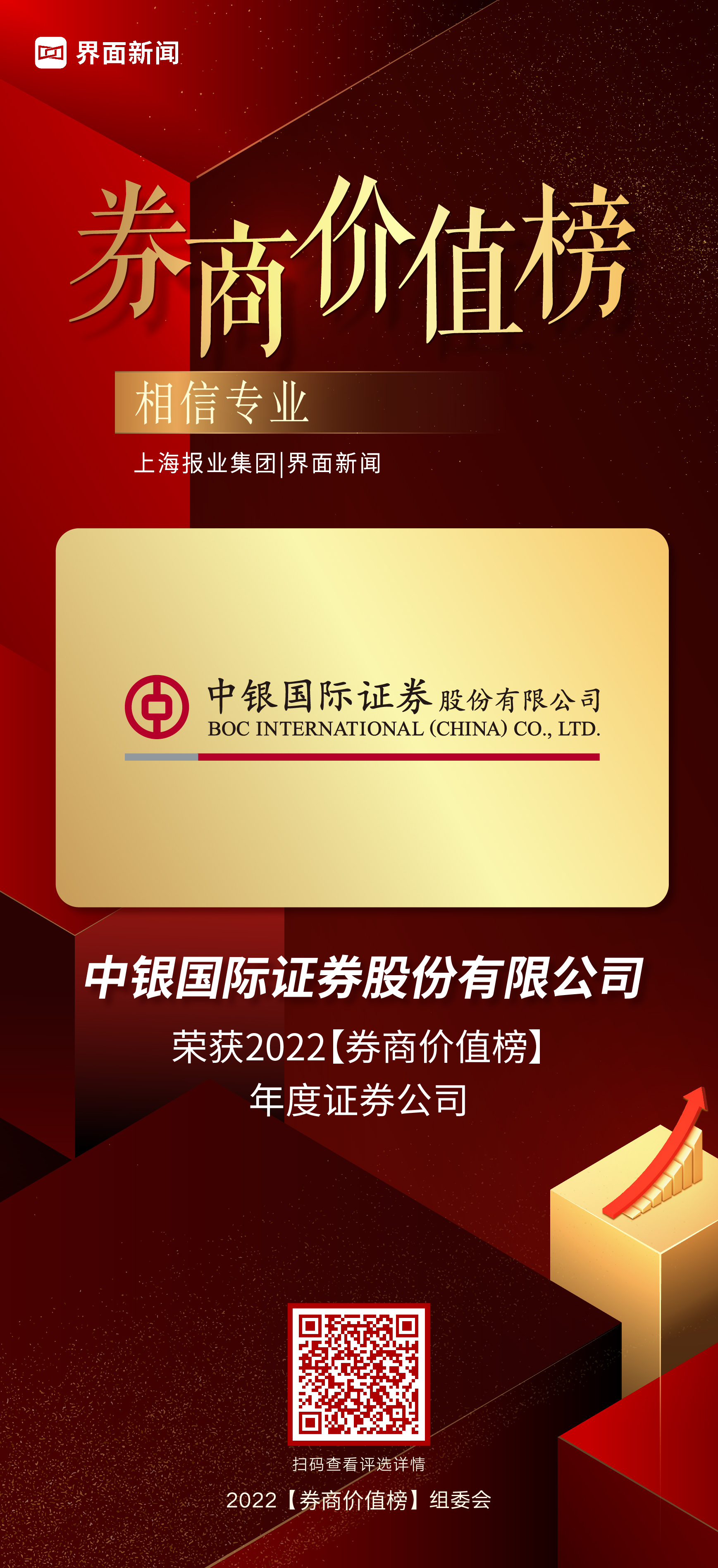 中银国际证券股份有限公司凭借为证券市场健康发展的贡献,荣膺【2022券商价值榜】年度证券公司。